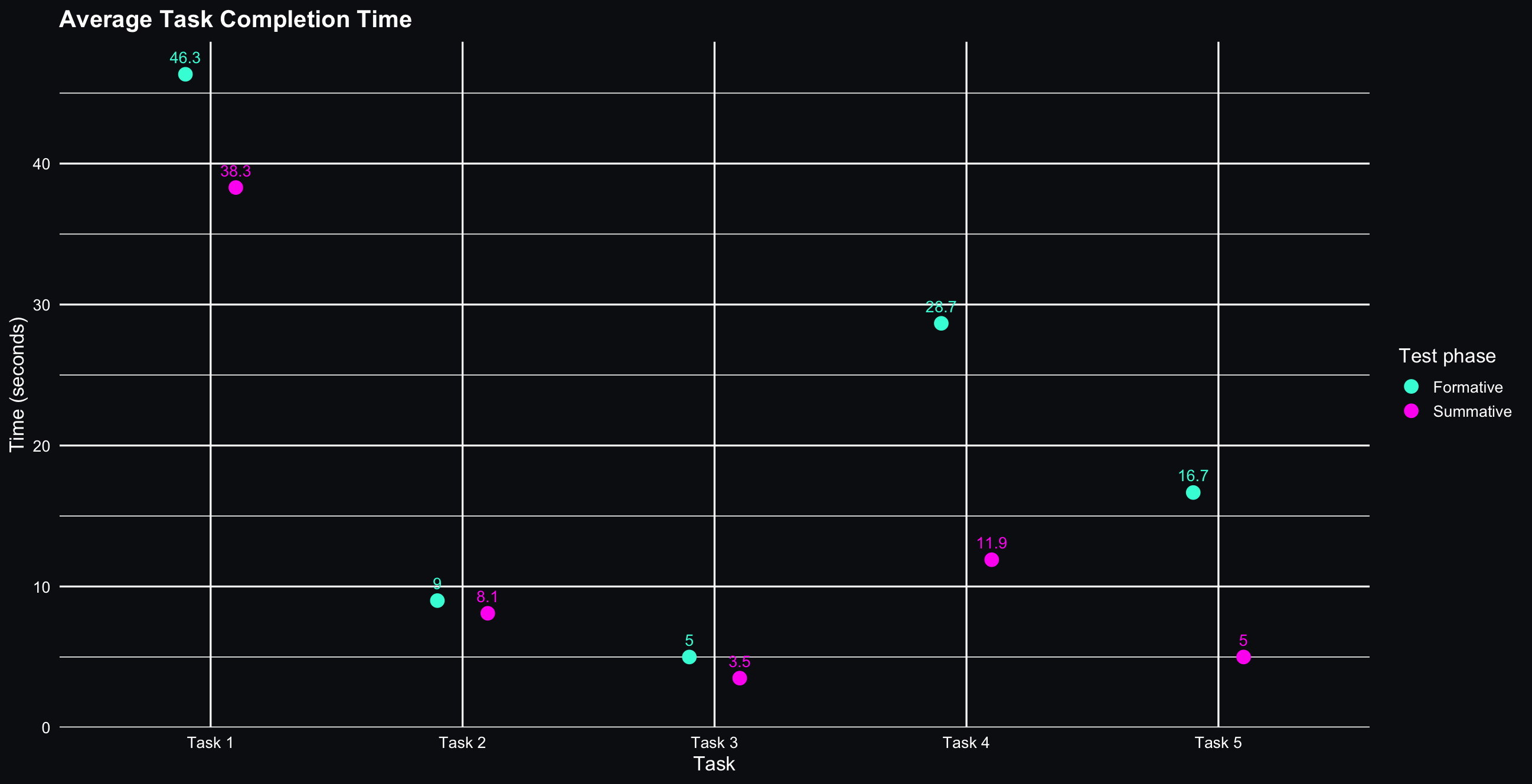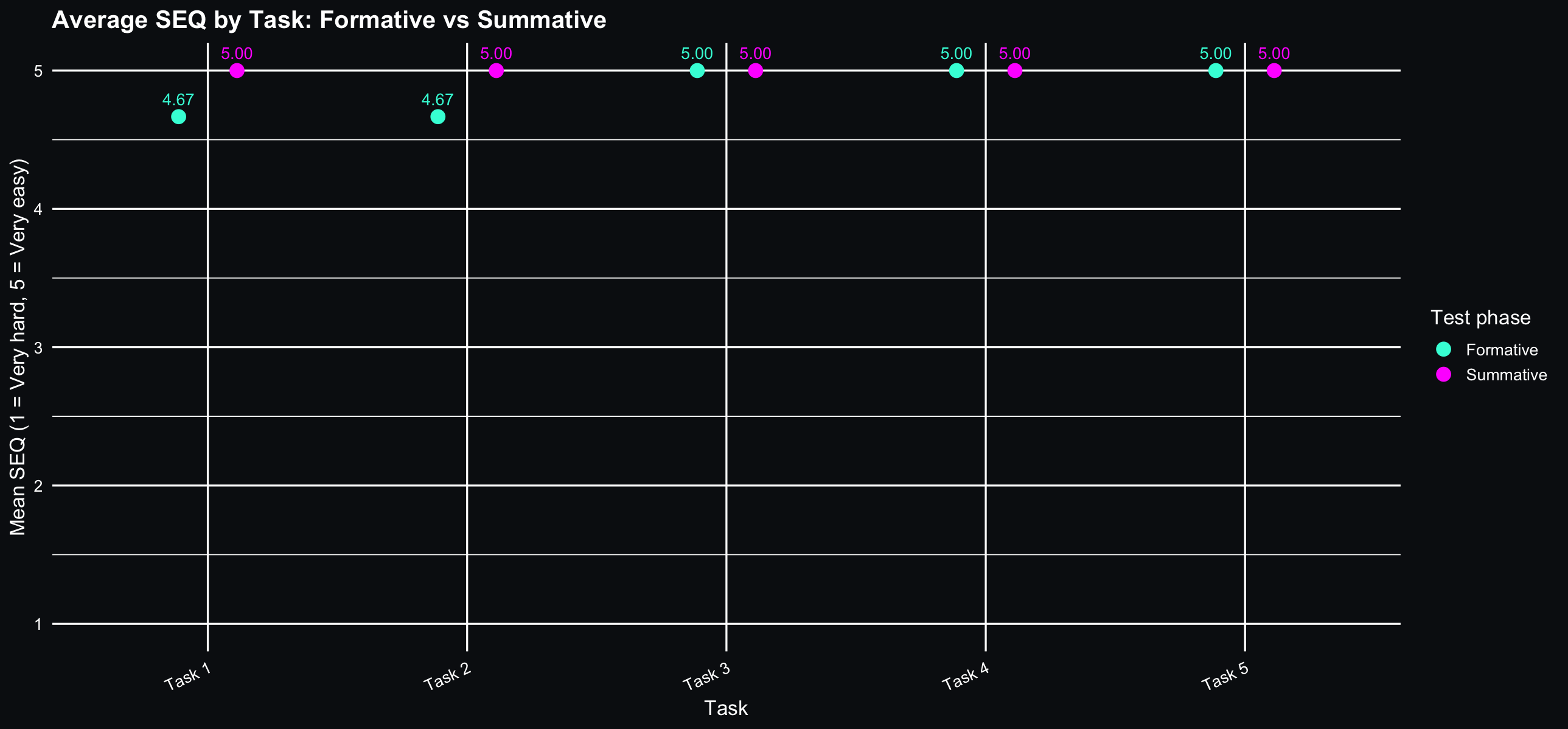 Visual comparison of formative vs. summative results (SEQ, SUS, and task completion time).