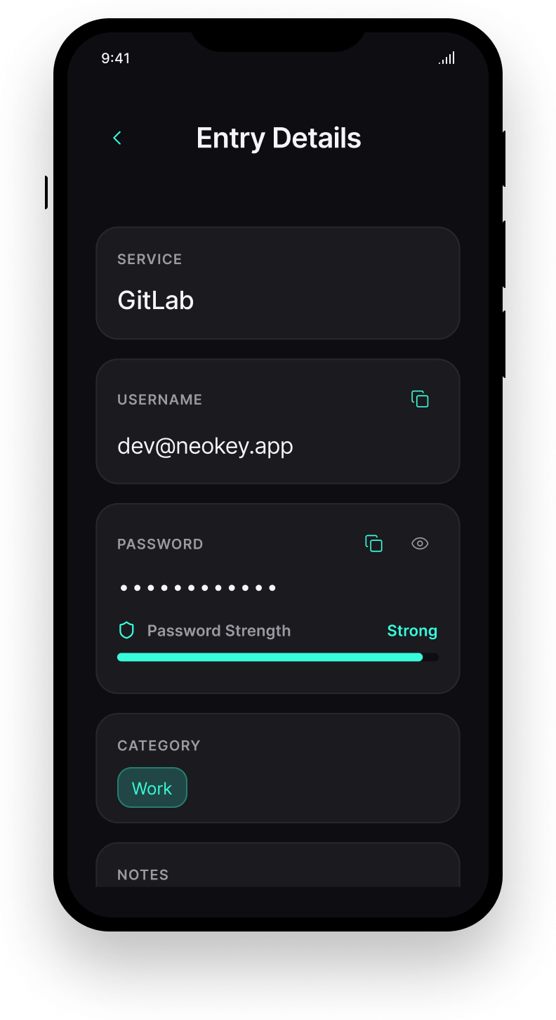 NEOKey is an offline-first Android authentication app that securely stores and manages secrets and generated passwords. All sensitive data is encrypted at rest and can be unlocked using biometrics or a master pincode.
